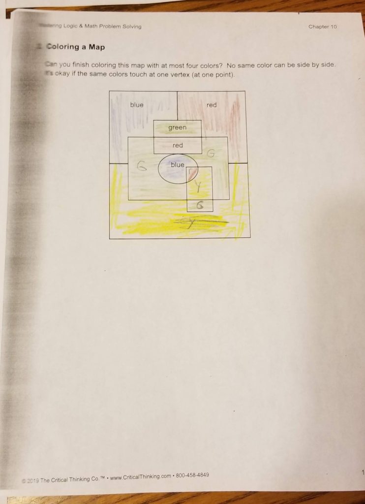 First of all, do not feel like you need to start at the beginning and just work through this whole book. That’s not necessarily the best way to use this book. You could do that with older kids who have all the skills necessary for all the problem categories, however, I found it better to pick and choose what problems I wanted my kids to attempt. I explored the book and found problems in different categories that I thought were an appropriate difficultly level for my sons. We have enjoyed many of the multicultural logic problems, and the brain teasers. My older son enjoyed the Topology and Geometry related word problems the most. He enjoyed the design and spatial reasoning aspect of these.