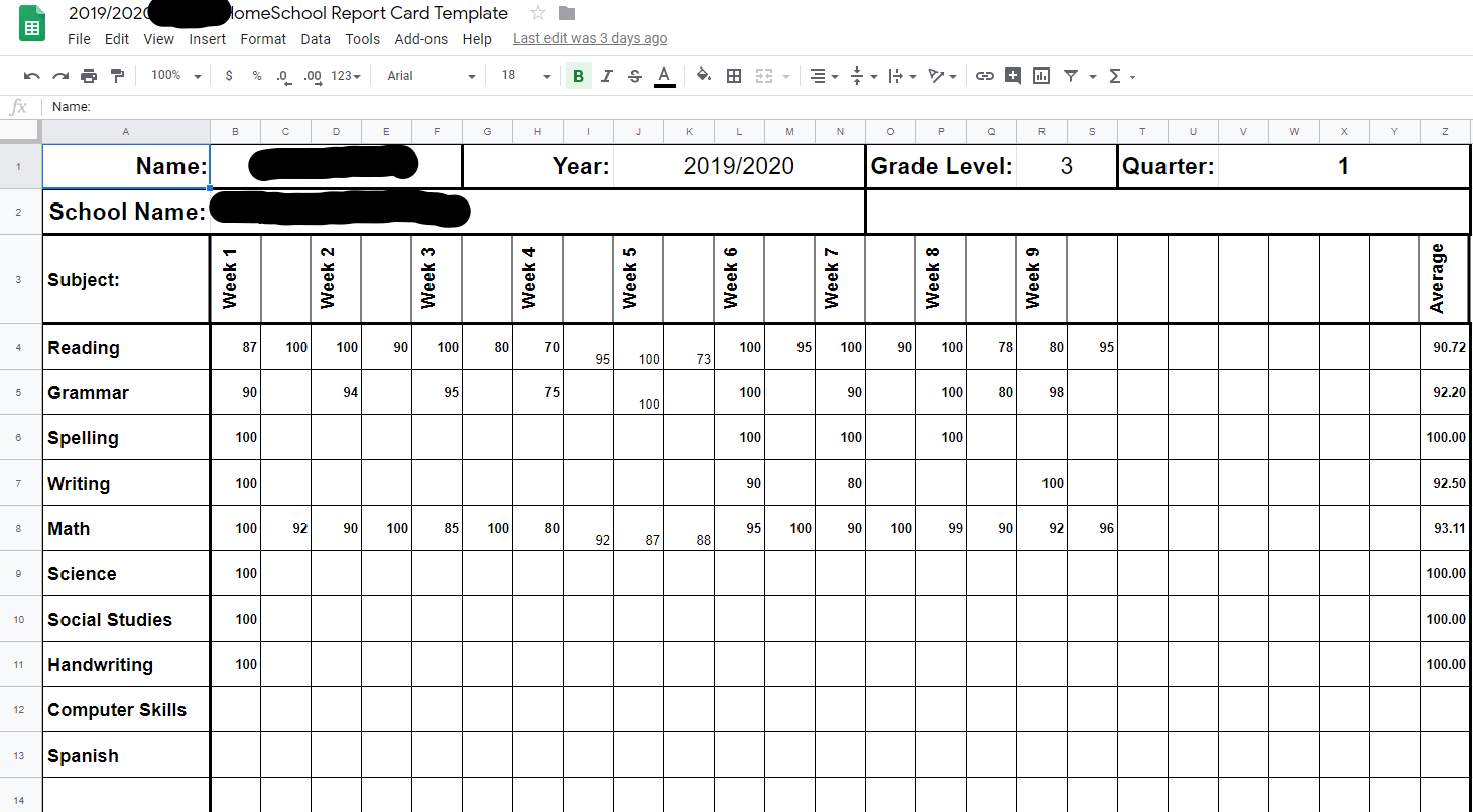 The Homeschool Report Card and Gradebook template is an editable xlsx spreadsheet. It enables you to keep records and report your child’s grades on all subjects during your homeschool year. The spreadsheet has 2 pages, a gradebook page and a report card page. The file is set up for single child use. However, you can easily use for multiple children by simply saving a copy of the blank template. Then save multiple copies for your each of your children each year to record their homeschool performance and progress.