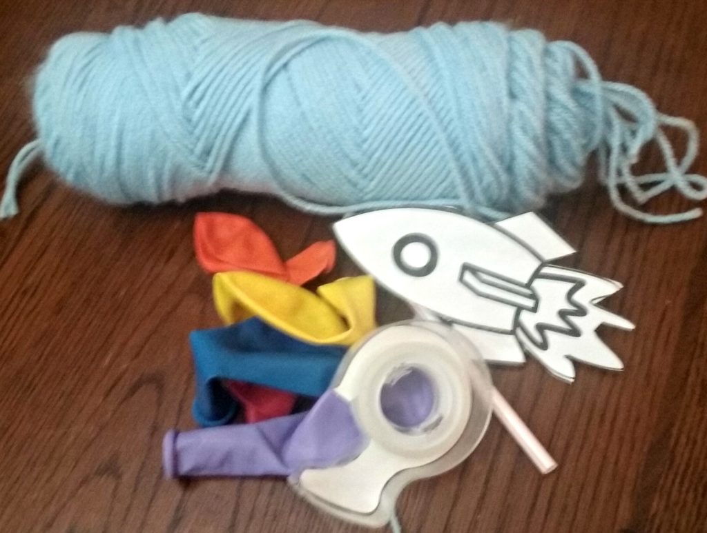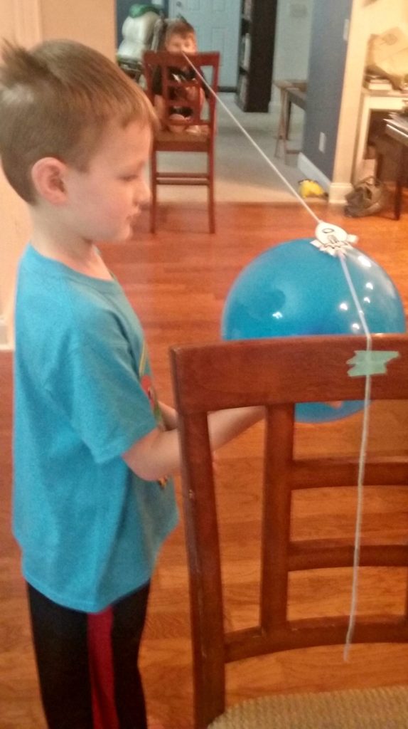 Next I had the kids help me set up our balloon rockets experiment. We spread out chairs about 15 feet apart. Then I got out a ball of string and taped the end to one chair, and walked the string to the other chair. After threading the straw onto the string I cut the string pulled it tight and taped it down to the other chair. Lastly, we taped a paper rocket to the straw. Now we were almost ready for takeoff.