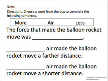 After many, many successful balloon rocket launches we sat back down to discuss what we found out. I made us a quick activity where the kids had to fill in the blank with the correct word. It got us calmed down, and I was able to make sure that the kids understood that air could be used as a force and the more air the greater the force. In just a few short minutes our group got a little reading and writing in to go along with our science. Then I had assessed that they understood what we were learning!
