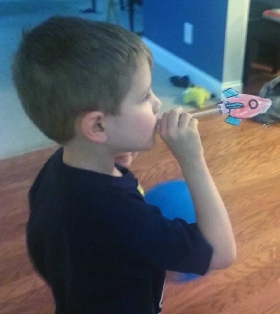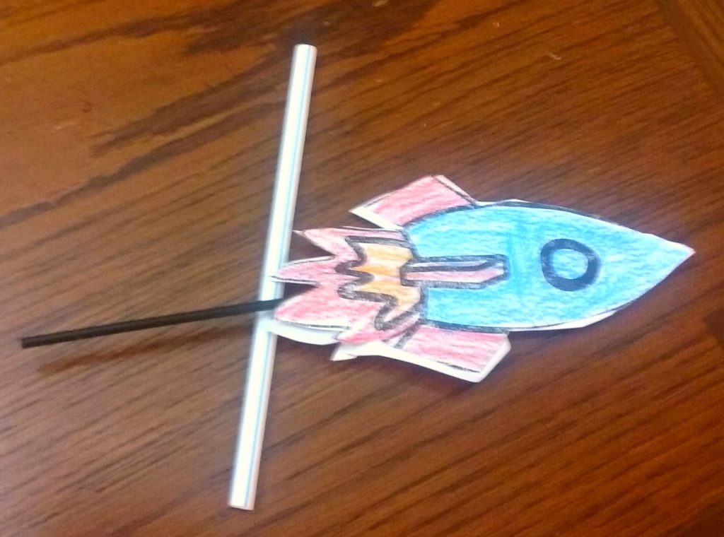I gave each of the kids a copy of a template I made with 2 rockets to color. It only took a few minutes for the kids to color them and then cut them out. We then glued the the 2 rockets together with a coffee stirrer in the middle. I gave each of the kids a straw and had them stick the coffee stirrer in the straw. Then they blew as hard as they could through the straw to make their rockets take off! They took turns launching their rockets then we did a quick competition to see who could make their rocket go the farthest. It was the perfect end to our science lesson!