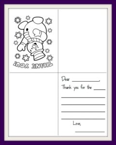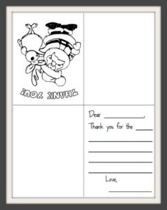 black and white, one-sided, thank you cards that the kids can fold and color. Simply print out the cards you want, fold on the lines, let your kids color the picture on the front and fill in a simple note on the inside. Below are 3 separate links for the cards for you to print: